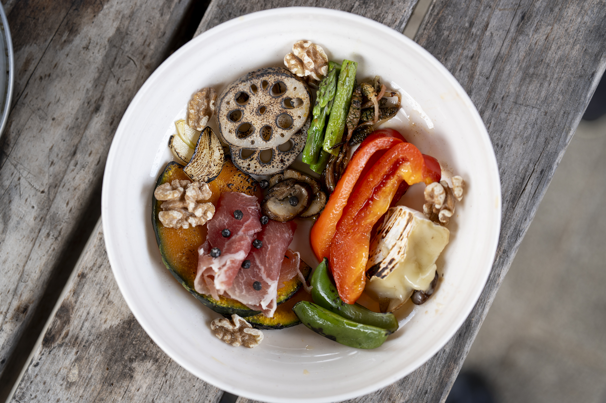 時計回りでアスパラ(さぬきのめざめ)、本日調達したツクシ、赤パプリカ、焼いて焦がしたカマンベール、スナップエンドウ、カボチャの上に生ハムとカンポットペッパー、ニンニクスライス。